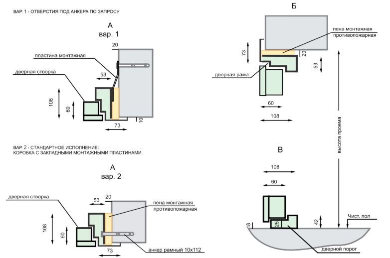 Под подходящий вам вариант монтажа двери мы изготавливаем подходящий вариант конструкции двери. На схемах представлены варианты крепления наших дверей в стандартный проем.